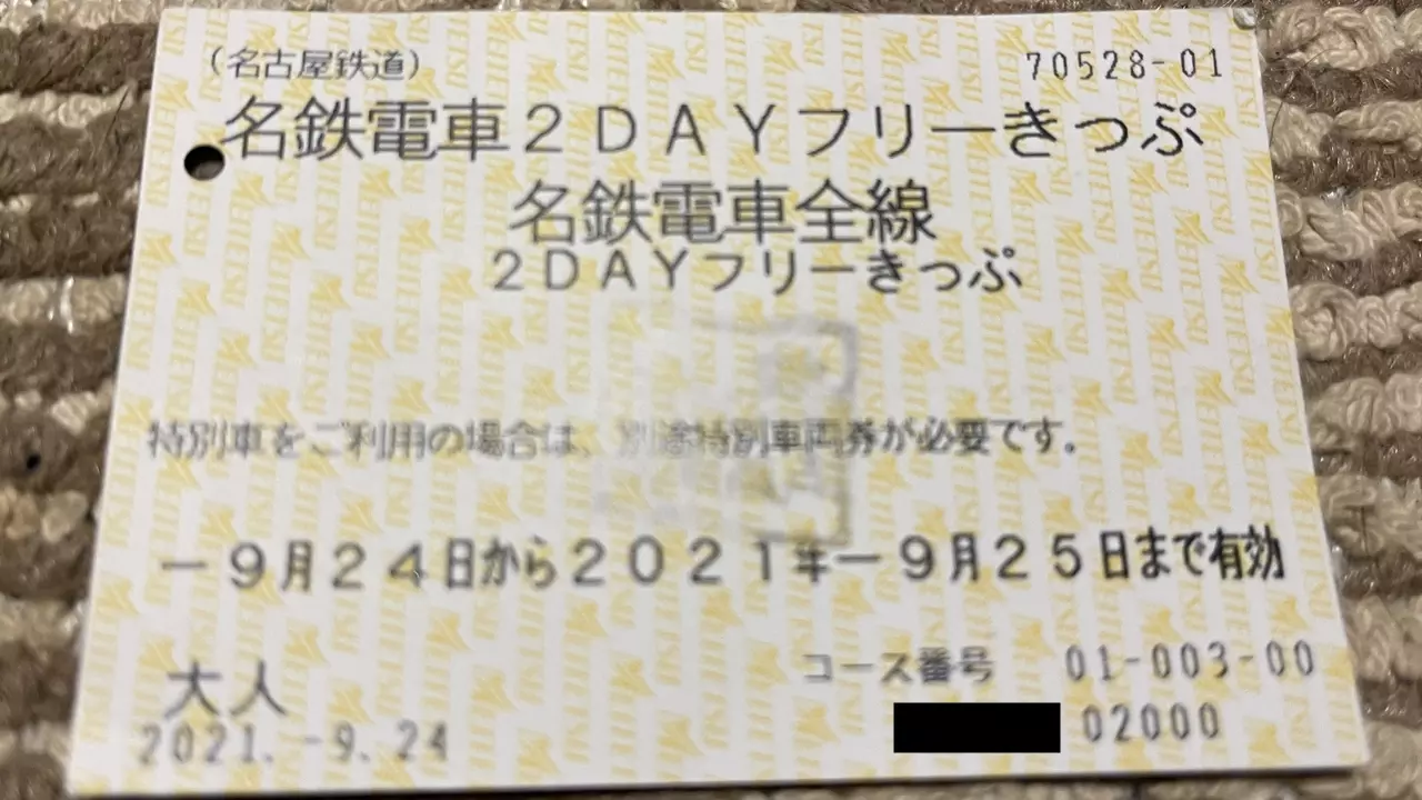 今回使用したきっぷは「名鉄電車全線2DAYフリーきっぷ」です。1日全線走破チャレンジなのになぜ2日間乗り放題のきっぷを購入したのかというと、「出発地に前泊するため移動費が必要だから」です。