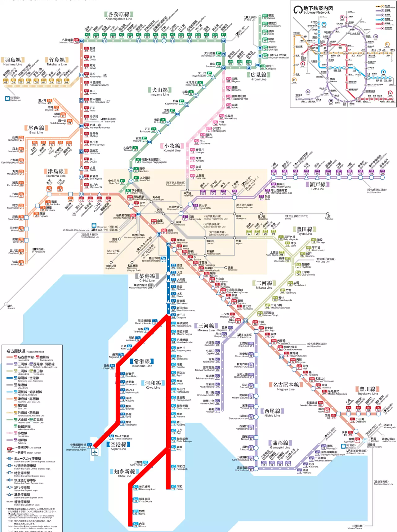 車内にあった名鉄の路線図を見て今までの旅程を振り返ります。ゴールまであと少し!